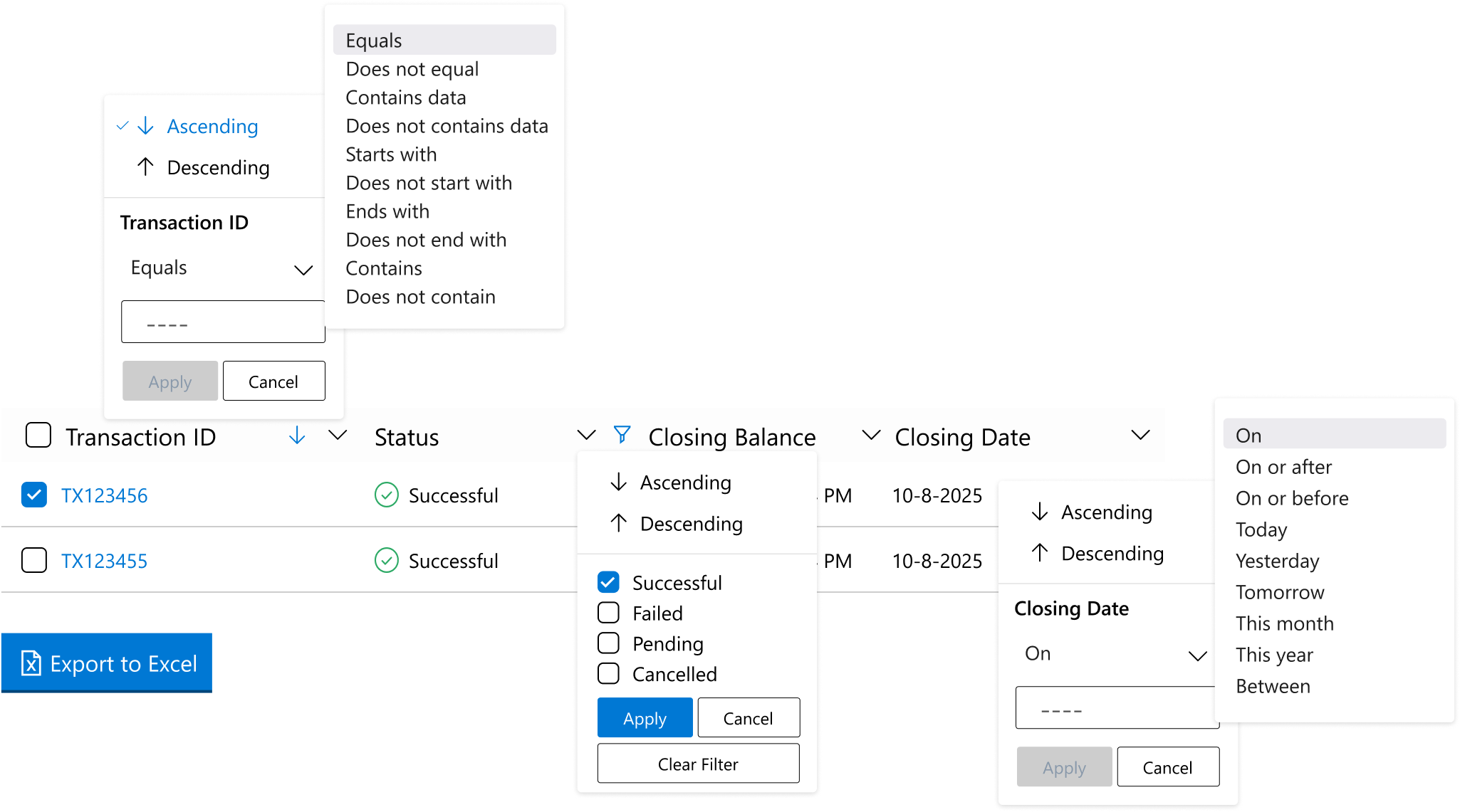 The dashboard features an Advanced Search tool for quickly finding transactions by parameters like date, type, and status. Custom Filters allow users to narrow results based on specific criteria. Once data is displayed, users can easily Export to Excel for further analysis or reporting. This makes data management more efficient and accessible.